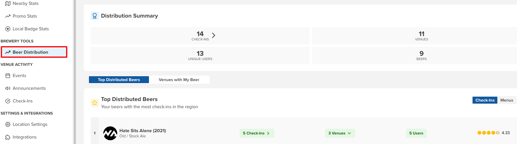 Premium users who are breweries can access the Beer Distribution Stats dashboard, which provides a focused view of how your beers are performing across venues (both verified and unverified) on Untappd: