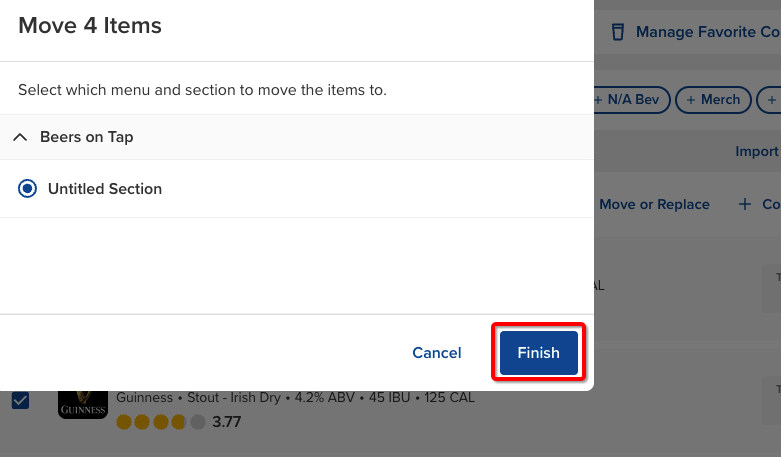 Click on the name of the menu to expand the list of sections, then select the section you want to move the drinks to. Click Finish to complete.