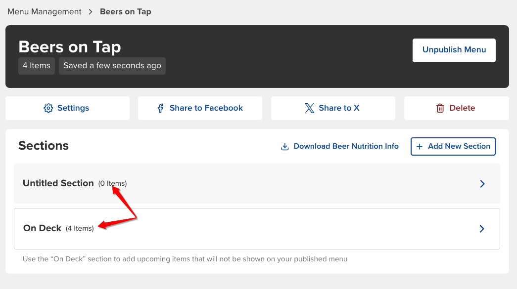 Every menu when set up automatically has two sections; an Untitled section and a separate one down below that says On Deck. If your menu looks like either of the examples below, you have mistakenly deleted the given Untitled section and set everything up in the On Deck section, or simply added the drinks only to the On Deck section. You will need to take corrective action: