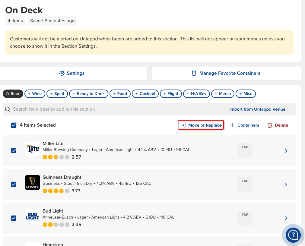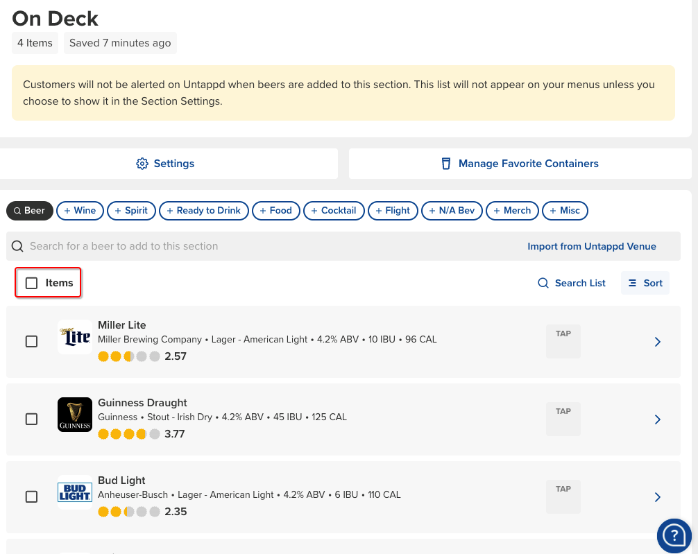 Once a new section has been set up where the drinks can be housed, go to the On Deck section where the drinks are currently located and check the box next to Items to select all of the drinks: