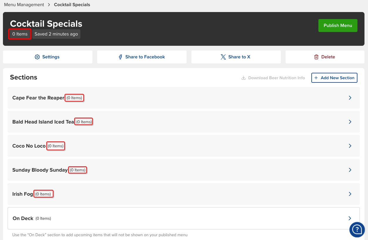Check your menu to see if you have made each item an individual section. If it shows (0 Items) next to the menu name; this is a giveaway that the menu is incorrectly structured as menus with 0 items will not show in the Untappd app or on print menus, digital boards, etc. as shown below: