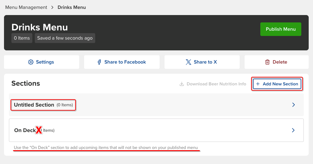 Every menu when set up automatically has two sections; an Untitled section and a separate one down below that says On Deck. If your menu looks like either of the first two examples below, you have mistakenly deleted the given Untitled section and set everything up in the On Deck section, or simply added the drinks only to the On Deck section. You will need to take corrective action: