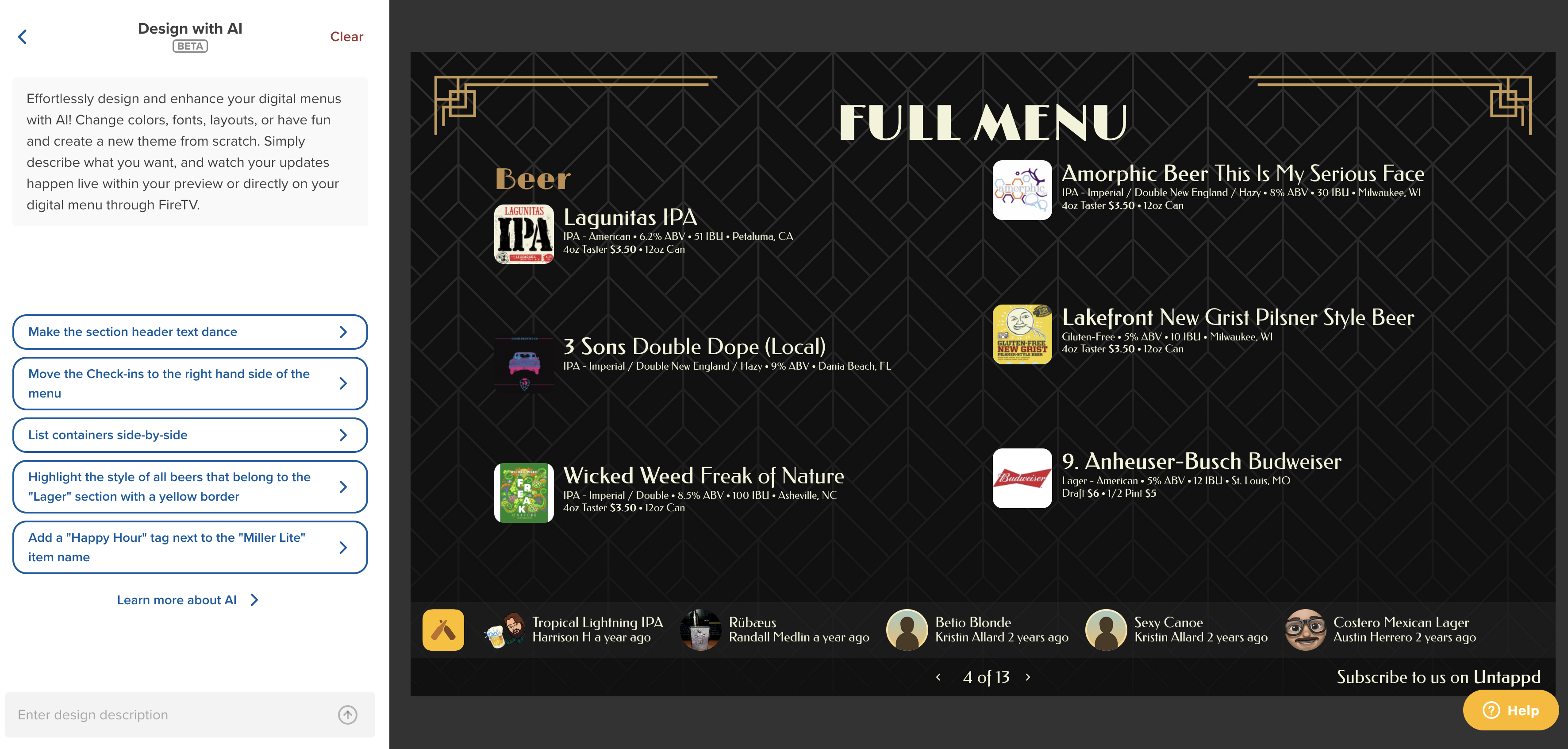 Transform your digital menus effortlessly with our Design with AI feature. Simply use your words to modify and customize your menu’s design. With this powerful tool, you can quickly and creatively update your menu’s appearance. Check out our example prompts in the screenshots below!