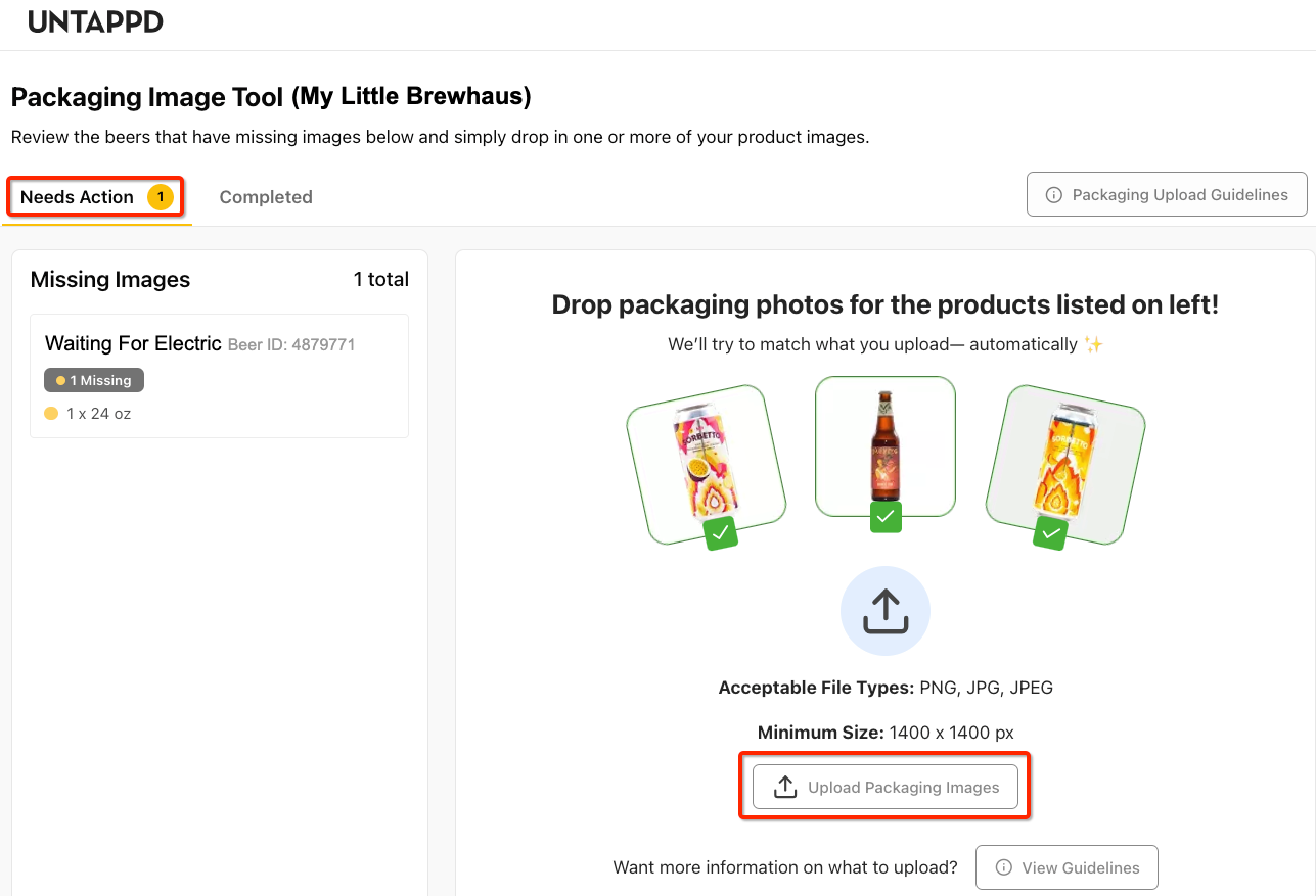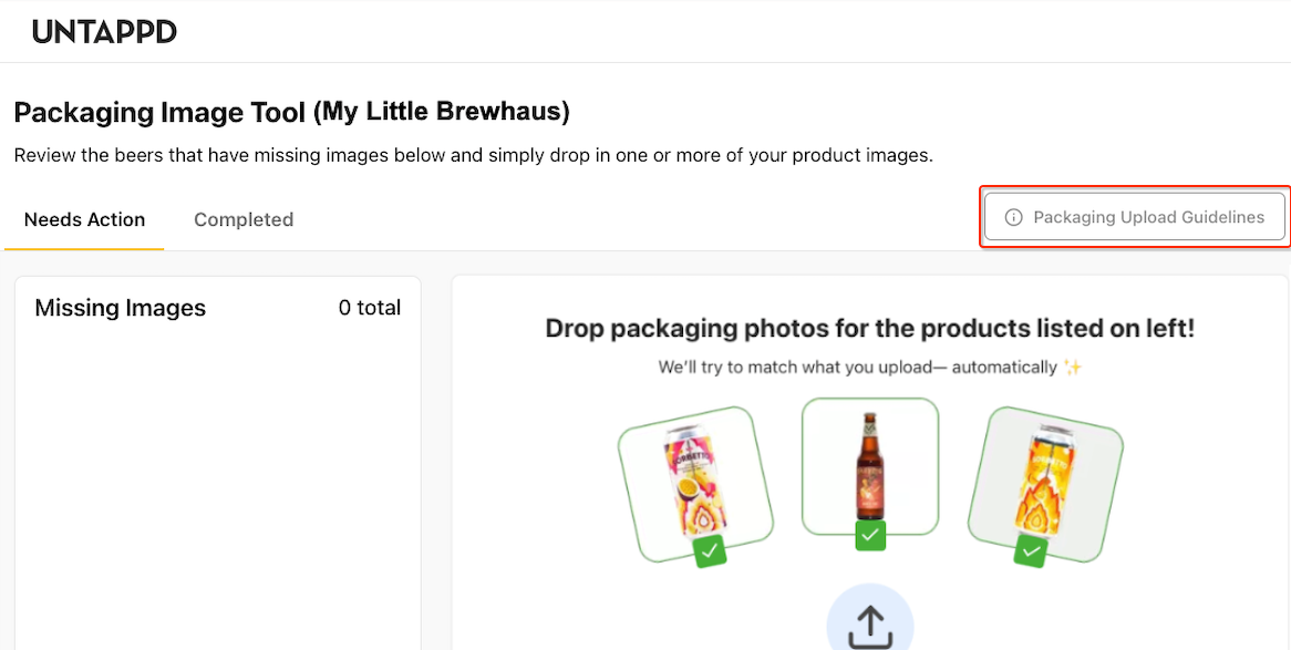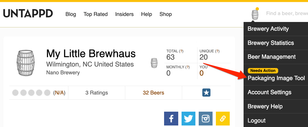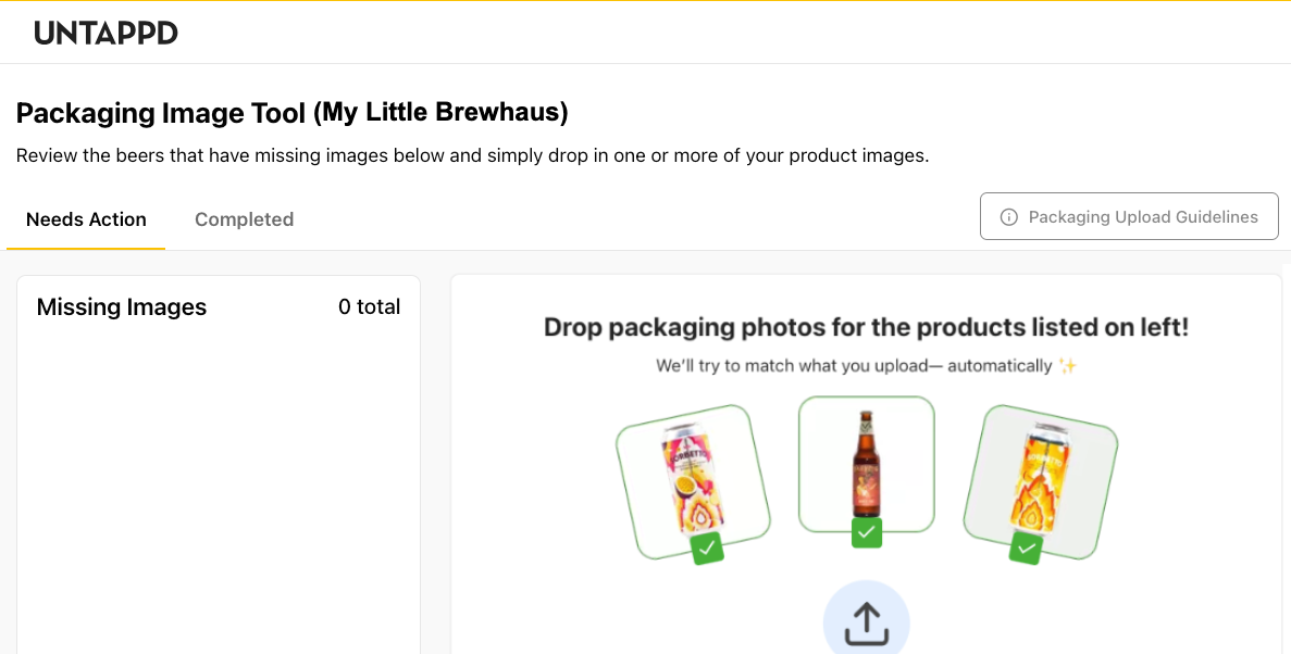 The tool is accessible to both the primary user of a brewery and any/all of its managers. If you’re already logged into your brewery account on Untappd, to get started you can navigate directly to https://next.untappd.com/brewery/portal. Otherwise, log into your brewery account from a web browser (if you’re a manager, log into your personal account then navigate to your brewery page and click the “use as this brewery" link at the top). From your brewery account landing page, hover over your brewery logo in the upper right next to the search bar and open the admin dropdown menu. There you’ll see the option, “Packaging Image Tool.” If you have missing images, you’ll see a yellow dot over your logo before the menu opens, as well as a “Needs Action” callout above the portal link.
