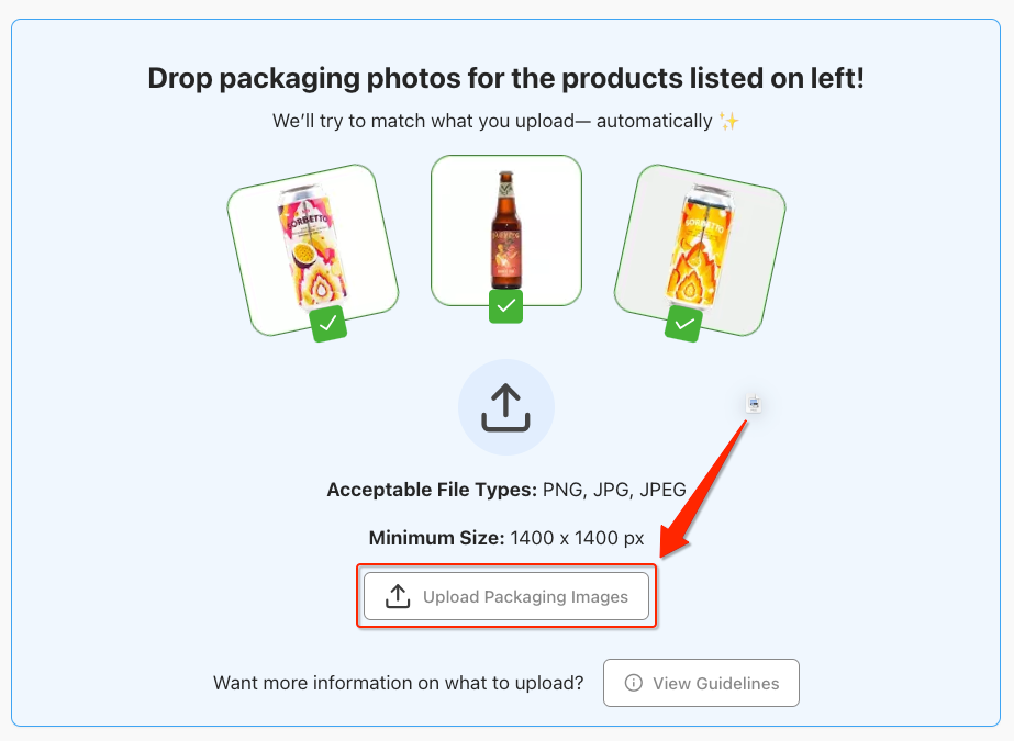 To upload images, you can either drag and drop them anywhere in the blue-shaded area shown below, or, click the “Upload Packaging Images” button to pull them from your saved files: