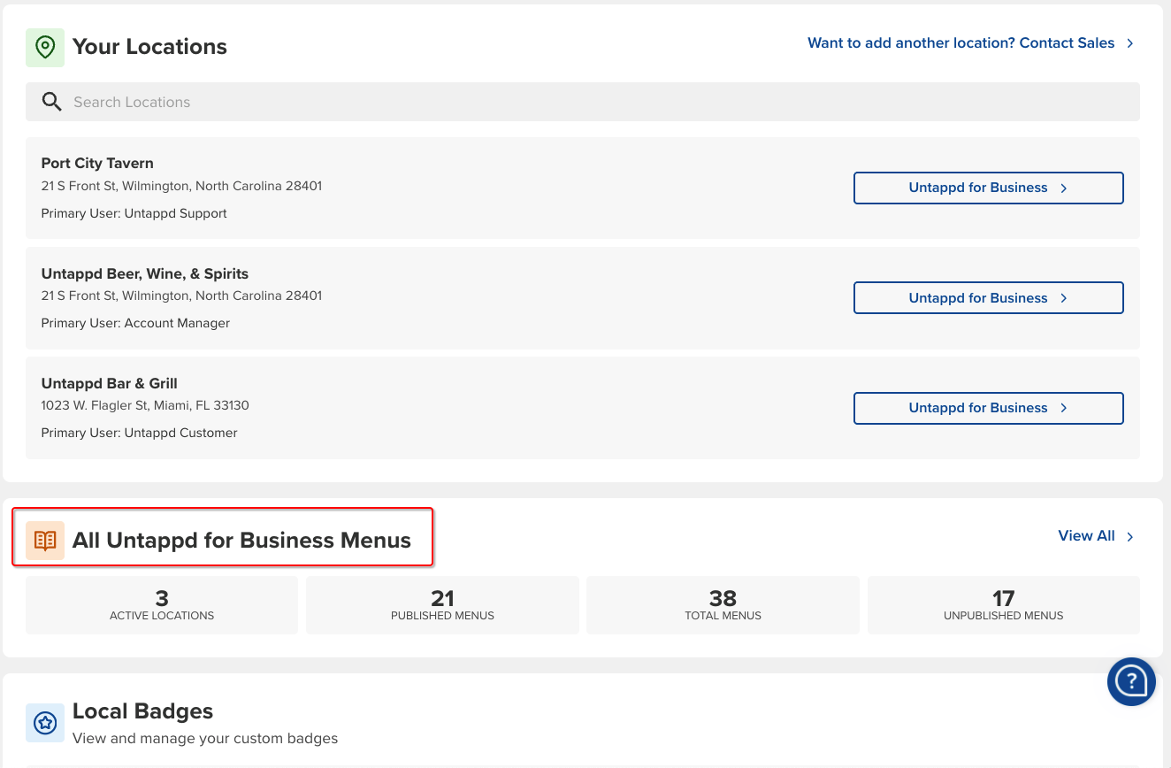If you are a member of two or more verified venues, you will see an additional tab in the top left corner of your landing page and the All Menus box on the right which contains information about your menu status across all locations you have access to: