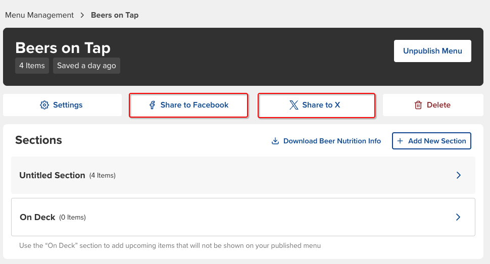 You can also share your menu quickly and easily by clicking the "Share to Facebook" and "Share to X" buttons on your menu: